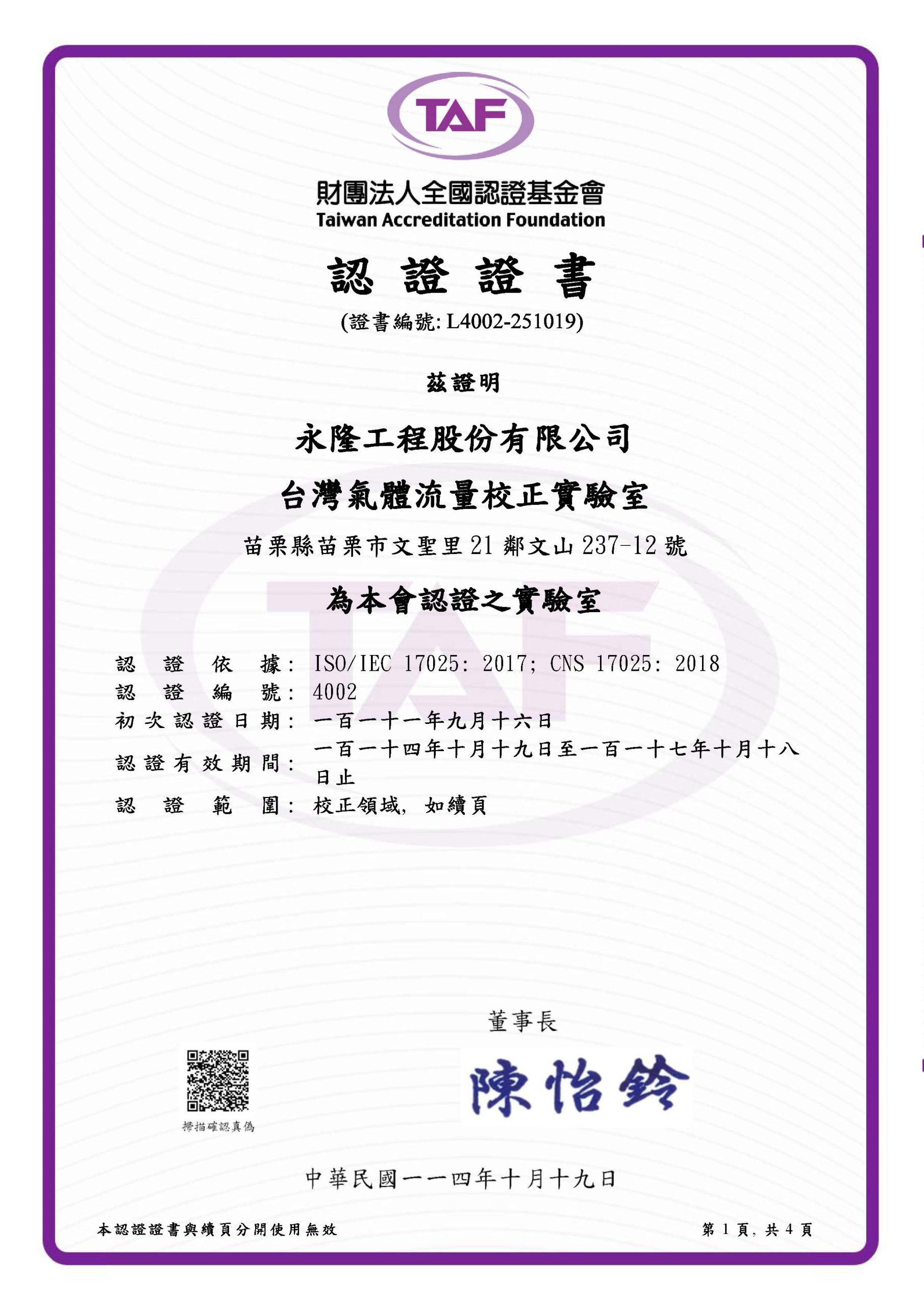 台灣氣體流量實驗室TAF認證證書